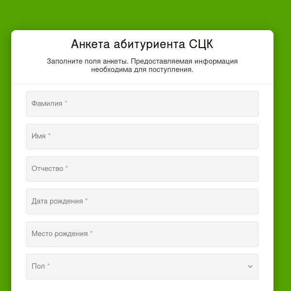 Анкета абитуриента СЦК Анкета сбора данных для оформления и создания документов абитуриента колледжа.https://forms.pro-educate.ru/mdc-abitur/