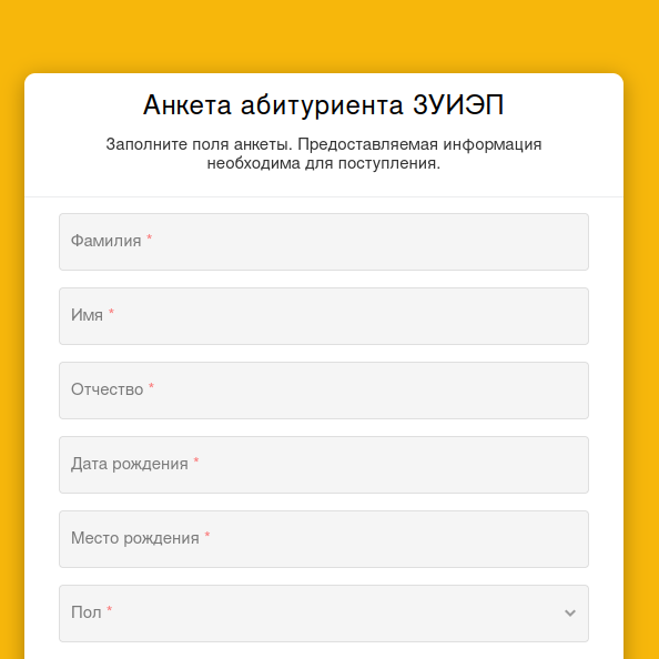 Анкета абитуриента ЗУИЭП Анкета заполнения полей карточки контакта используемых при заполнении документов абитуриента института. https://forms.pro-educate.ru/zuiep-abitur/
